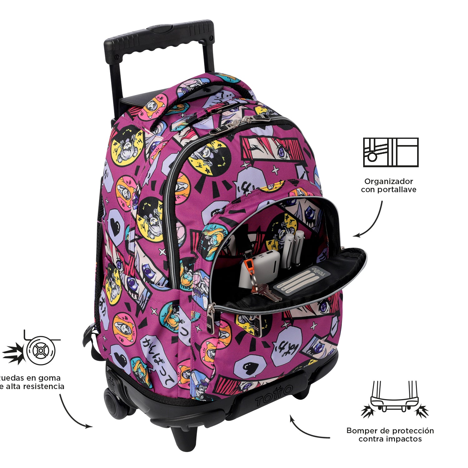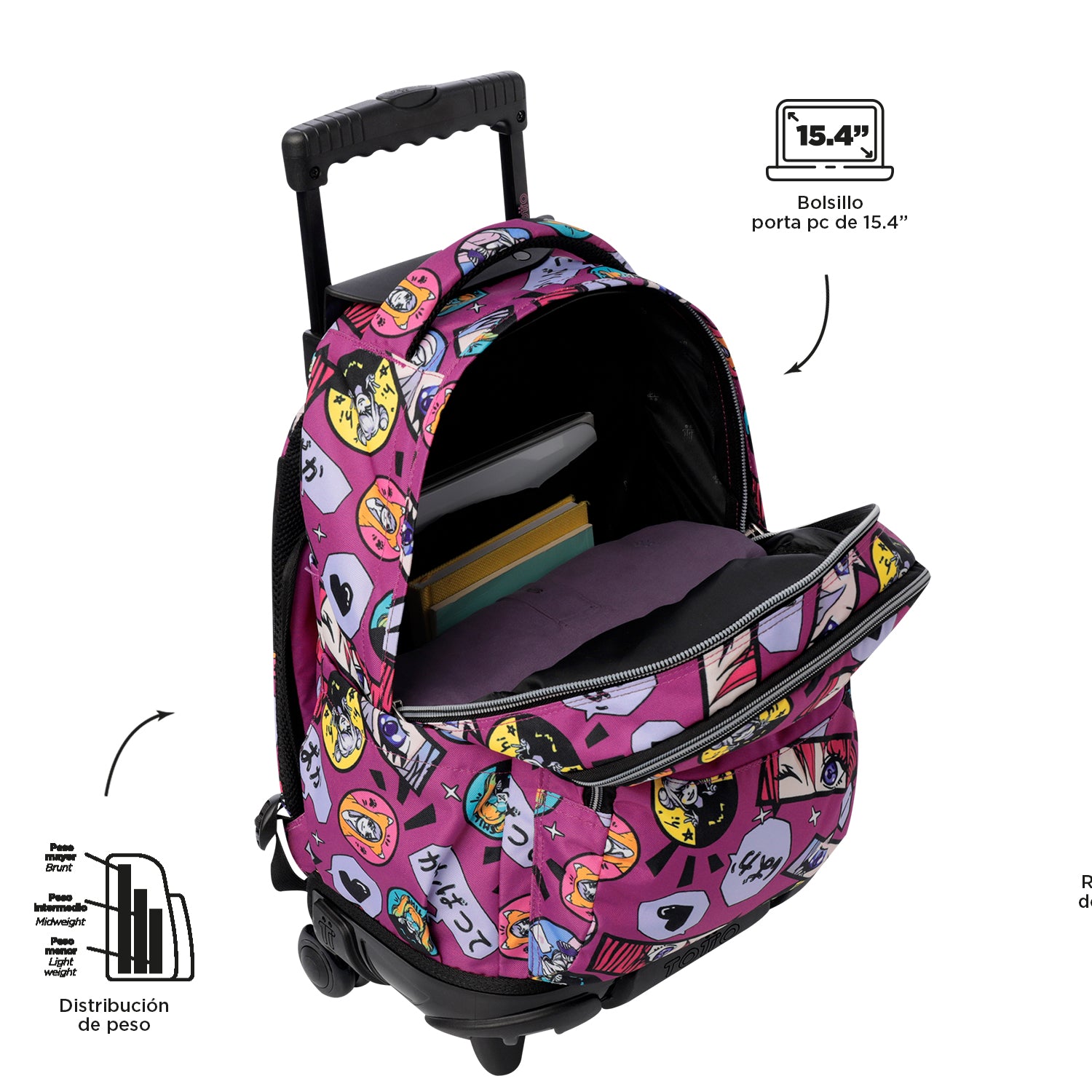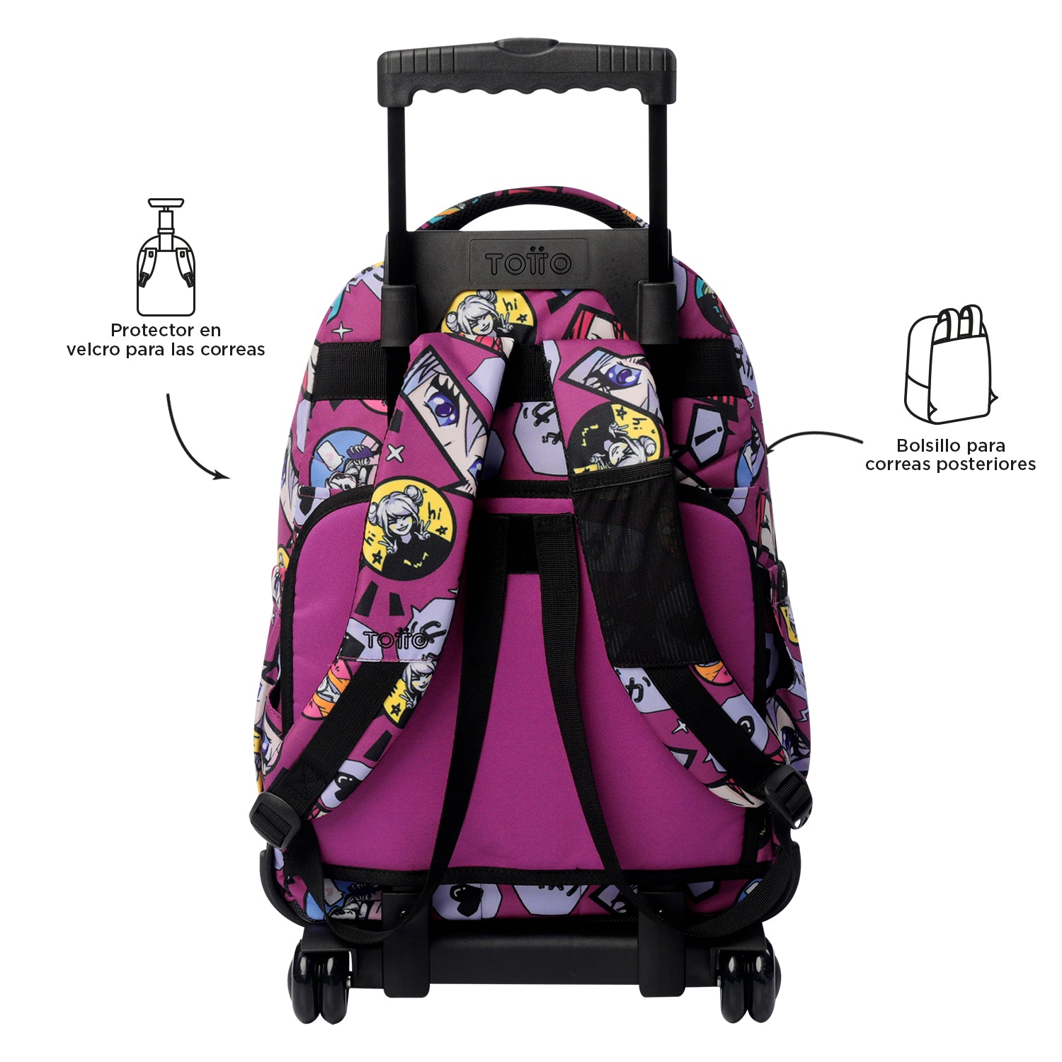 Trolley Escolar Renglones, mochila com rodas, produzida em material ecológico RPET, com 32 x 45,5 x 18 cm e capacidade de 35 litros. Apoio ergonômico para as costas. Inclui um sistema de distribuição do peso, capa protetora para as rodas e alças para levar a mochila às costas. Com reforço em borracha na base. Tem 2 compartimentos sendo 1 com bolso para o portátil e 2 bolsos externos sendo 1 com porta-chaves específicas. Idades: 8 a 12 anos.