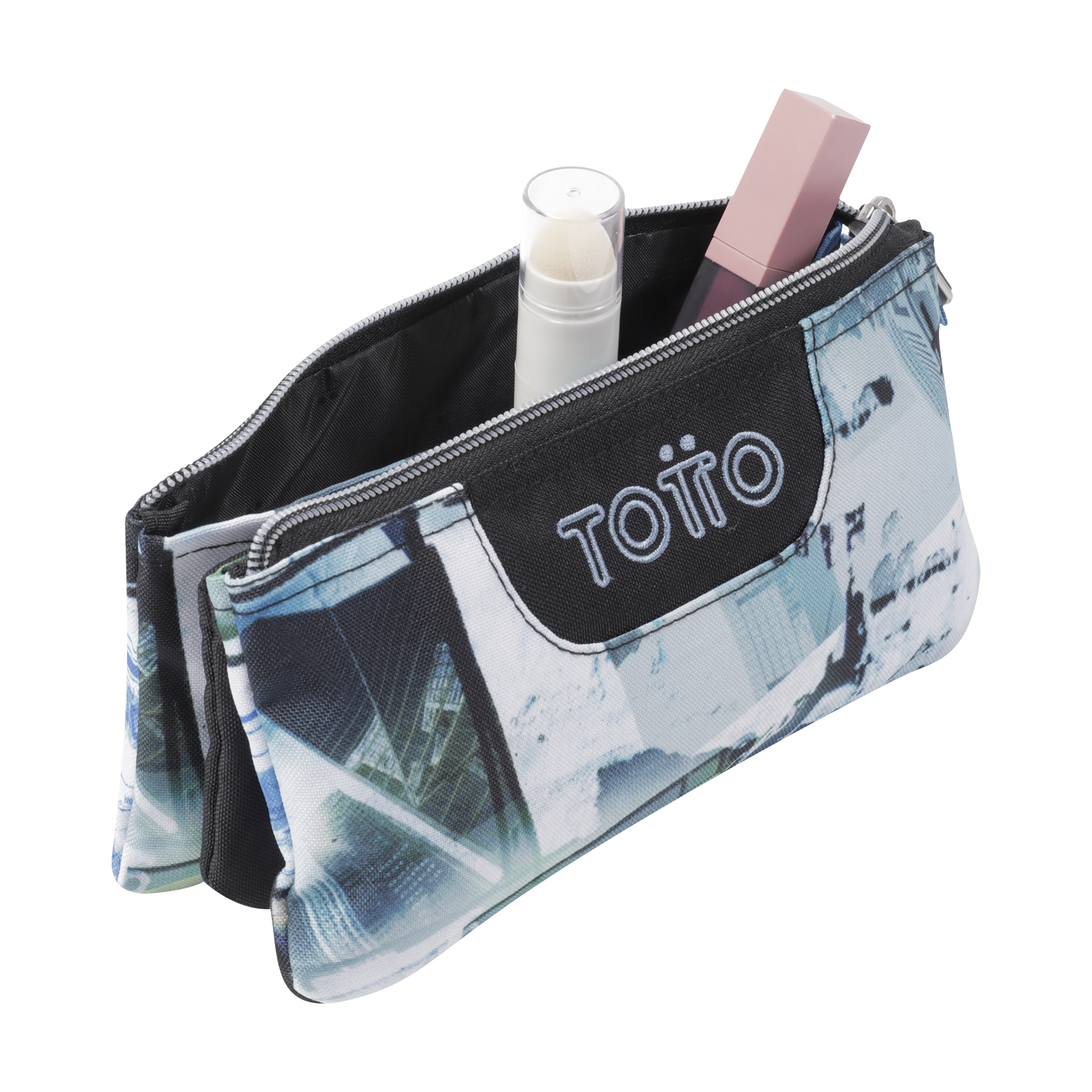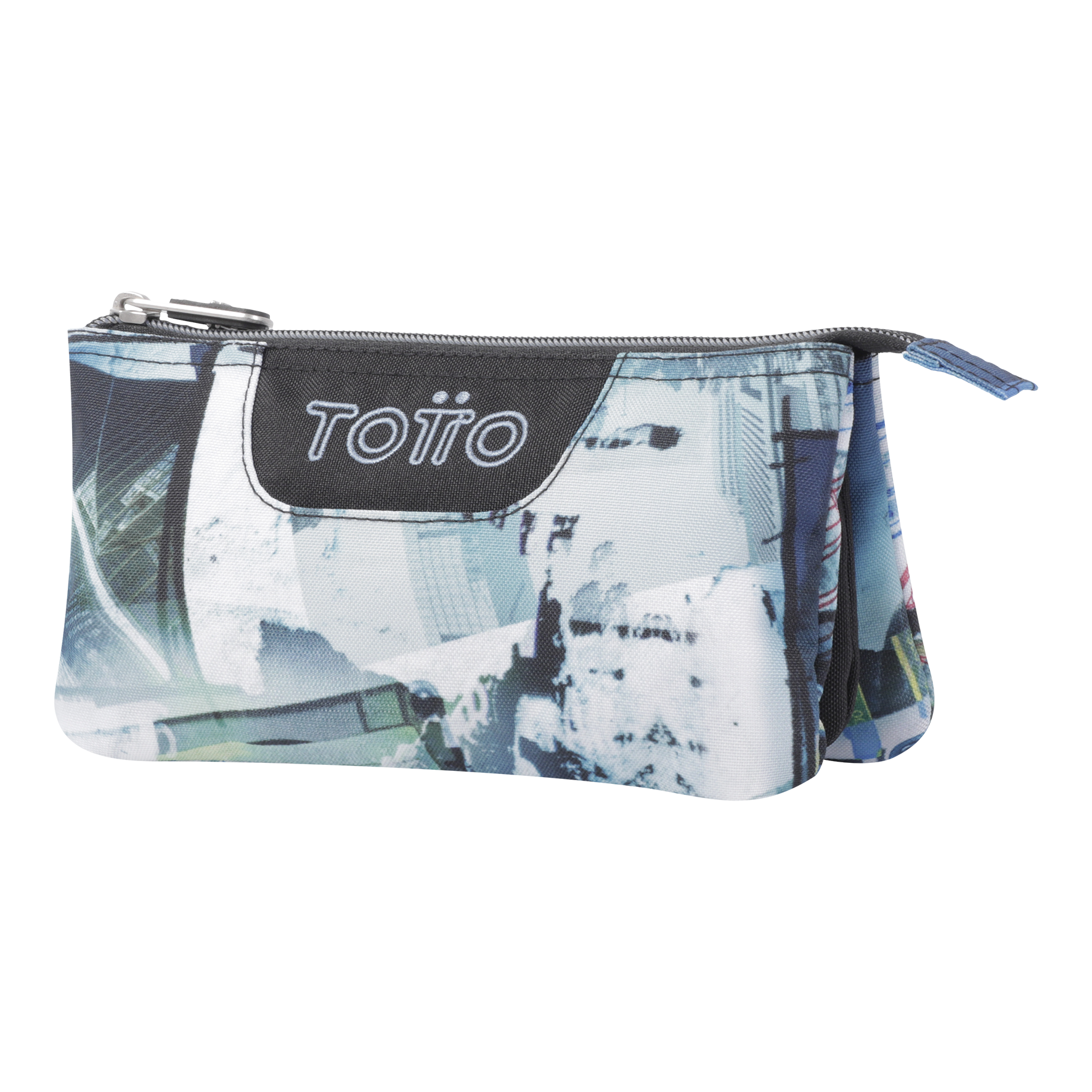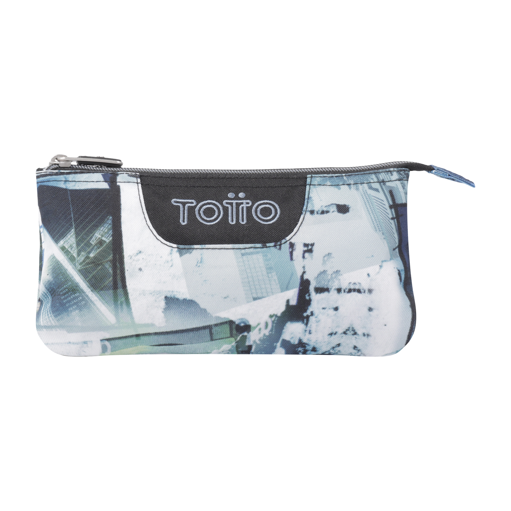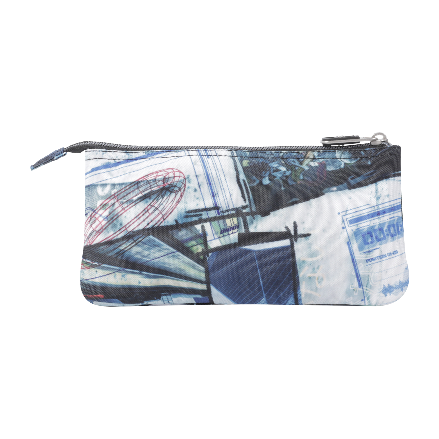Estojo produzido em material eco-friendly RPET, com 11 x 22 x 3,5 cm, e 2 fechos e 3 compartimentos.