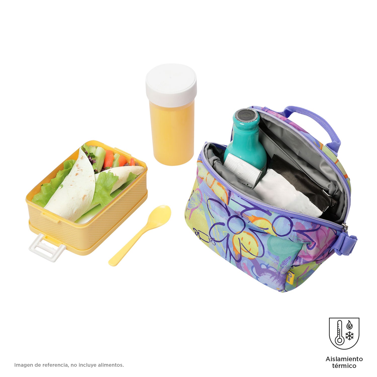 Organize seu dia com a lancheira modelo Borrador! Projetada com isolamento térmico para manter seus alimentos frescos por até 5 horas, ela é repelente a líquidos e fácil de limpar. Revestimento interno em PVC, lavável, secagem rápida e não detém odores. Inclui um elástico interno para transportar garrafas com segurança. Possui também uma pega e alça ajustável e uma alça traseira para prender em mochilas com rodinhas.
