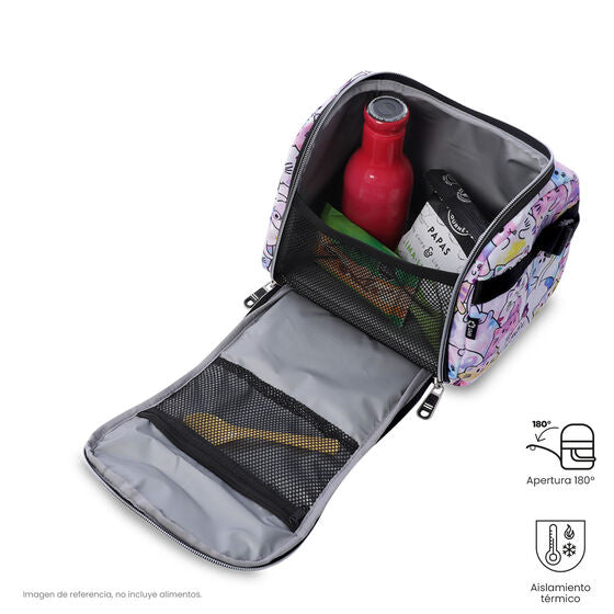 Organize seu dia com a lancheira modelo Resaltador! Projetada com isolamento térmico para manter seus alimentos frescos por até 5 horas, ela é repelente a líquidos e fácil de limpar. Sua abertura de 180° permite fácil acesso, enquanto bolsos internos de malha com zíper ajudam a manter tudo organizado.Revestimento interno em PVC, lavável, secagem rápida e não detém odores. Inclui um elástico interno para transportar garrafas com segurança. Possui também uma pega e alça ajustável e uma alça traseira para prender em mochilas com rodinhas.
