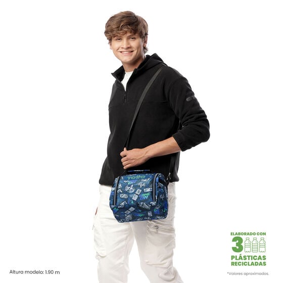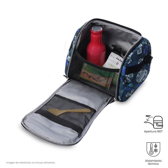 Organize seu dia com a lancheira modelo Resaltador! Projetada com isolamento térmico para manter seus alimentos frescos por até 5 horas, ela é repelente a líquidos e fácil de limpar. Sua abertura de 180° permite fácil acesso, enquanto bolsos internos de malha com zíper ajudam a manter tudo organizado.Revestimento interno em PVC, lavável, secagem rápida e não detém odores. Inclui um elástico interno para transportar garrafas com segurança. Possui também uma pega e alça ajustável e uma alça traseira para prender em mochilas com rodinhas.