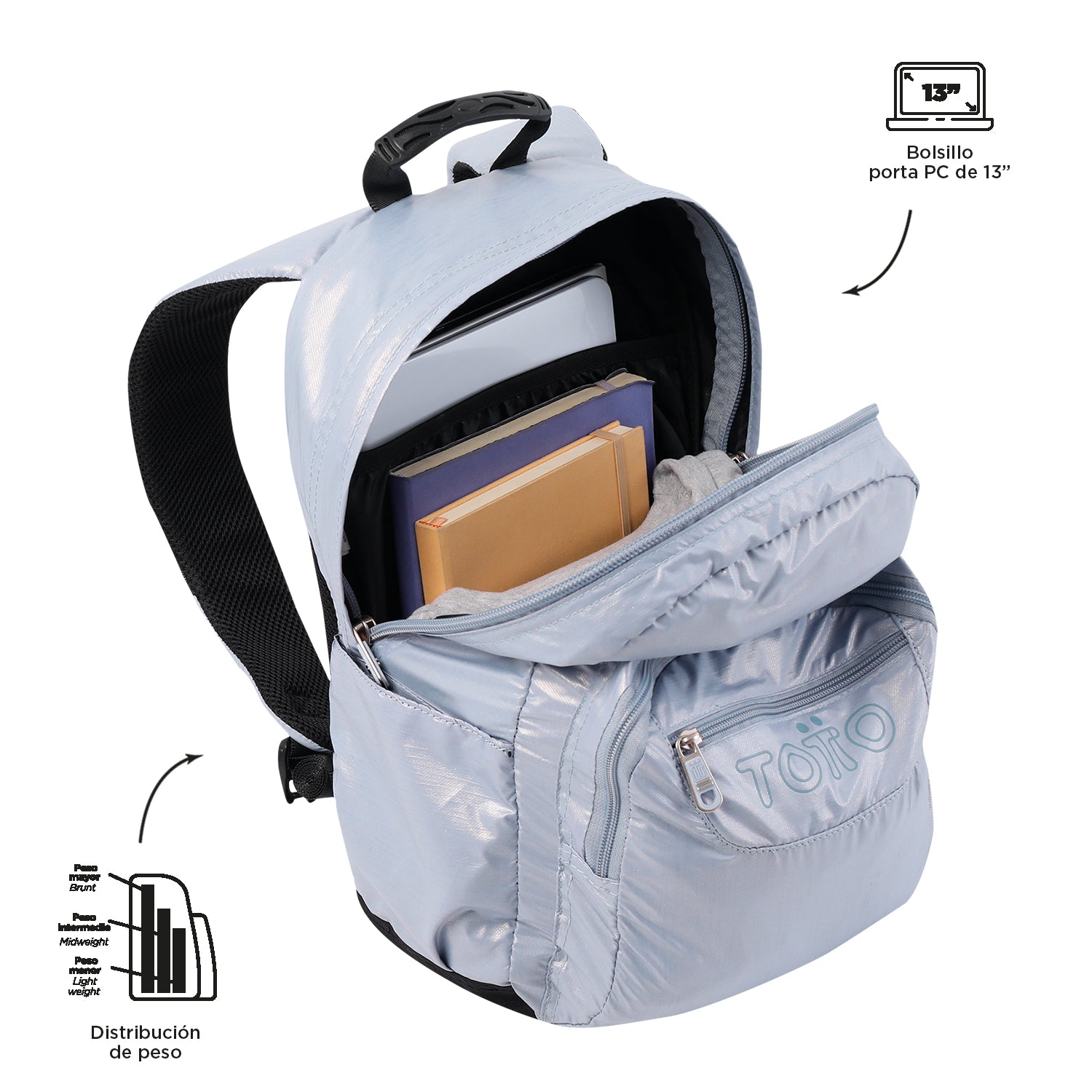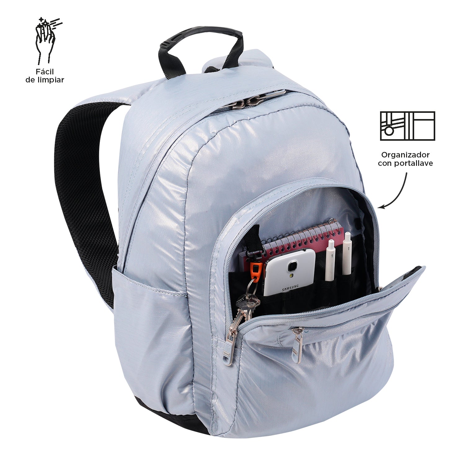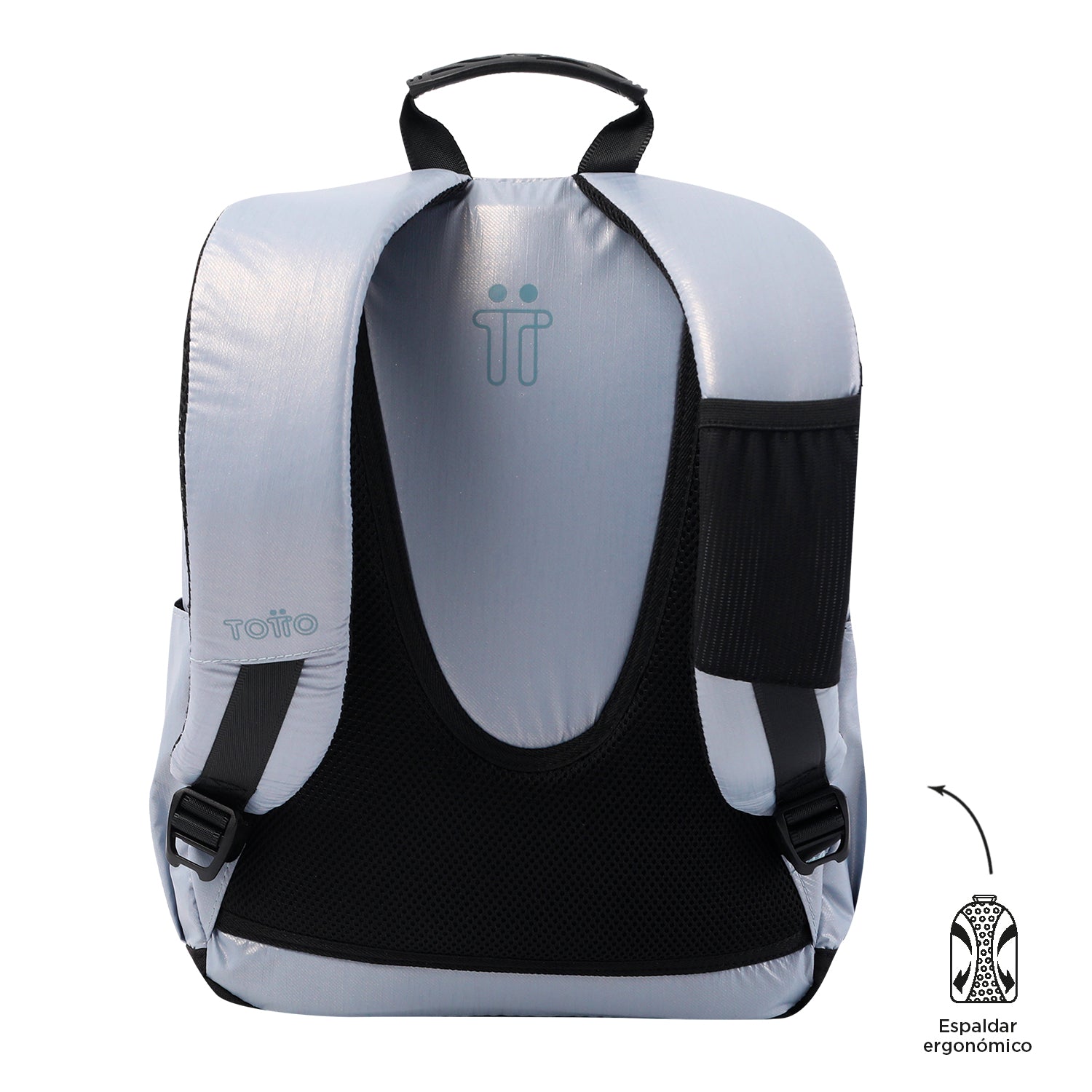 Mochila Escolar Gommel, produzida em material eco-friendly RPET, com 30 x 40 x 14.5 cm e capacidade para 17 litros. Tem um toque sedoso e é reflexiva. Concebida para distribuir o peso adequadamente, costas ergonómicas e acolchoadas e alças em forma de "S" para maior conforto também acolchoadas.Tem bolsos laterais para garrafa de água. Tem fecho de correr nos dos dois sentidos e dispõe de um compartimento para portátil e outro com porta-chaves removível.