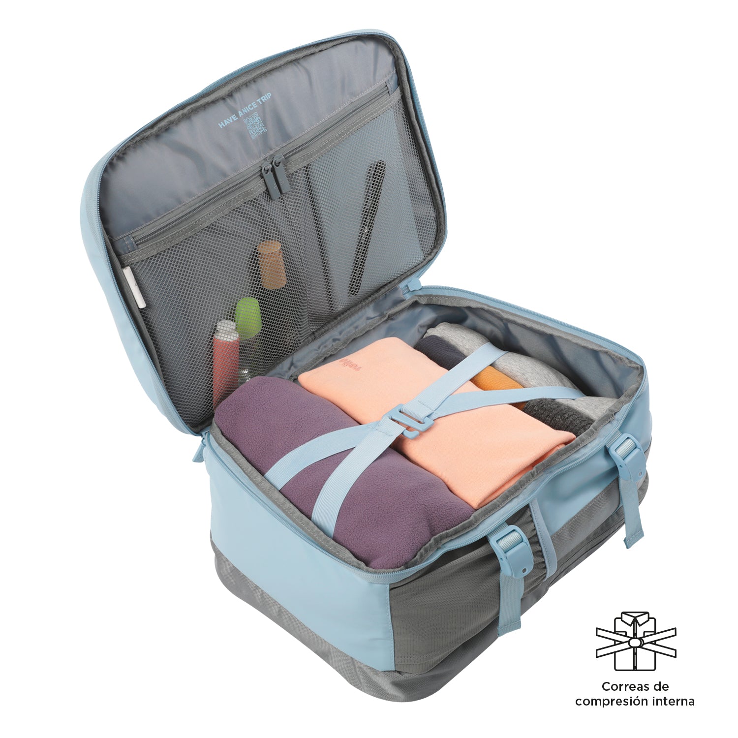 Mochila de viagem Trip, com dimensões aceitas por companhias aéreas de baixo custo como item pessoal. Grande capacidade com compartimento principal ajustável para várias roupas e bolso para laptop de 15 polegadas. Inclui alças de especificação e um chaveiro para discagem. Ideal para viajar com conforto e estilo.