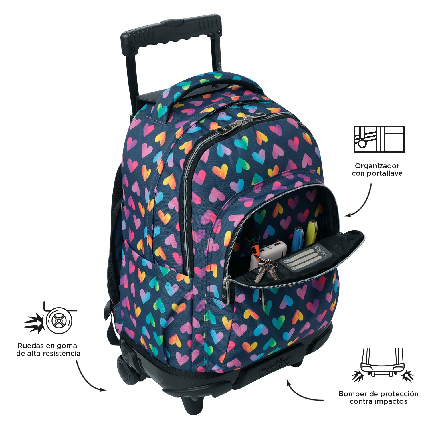 A mochila Renglones é ideal para crianças em idade escolar que precisam de um lugar confortável para carregar livros e materiais, graças ao seu design com rodas e carrinho. Este modelo grande, feito de lona RPET feita de garrafas plásticas recicladas, combina funcionalidade com uma abordagem ecológica. Ele oferece um compartimento para PC de 15,4 polegadas, um organizador com porta-chaves, dois bolsos para garrafa de água e rodas de borracha resistentes com amortecedores de proteção. Inclui uma alça telescópica, protetor de alça e rodas para evitar que as roupas fiquem sujas quando usadas nas costas. Disponível em uma ampla variedade de estampas para atender ao gosto dos pequenos. Uma escolha prática e ecologicamente correta!